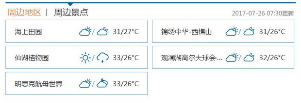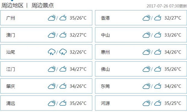 【深圳天气趋势】预计27日,多云间晴天,偶有短时阵雨或雷阵雨,天气炎热至酷热,中北部及人口密集地区最高气温可达35℃以上;28日多云有阵雨或雷阵雨,部分时间雨势较大;29-31日,多云为主,偶有短时阵雨或雷阵雨。