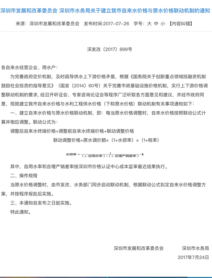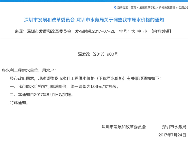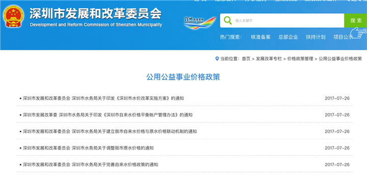 深圳市发改委与深圳市税务局联合对深圳市水价改革实施方案发布五个通知