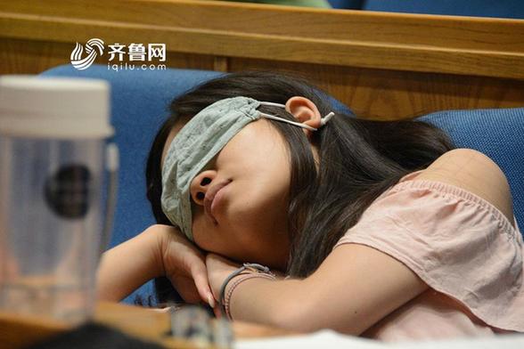 为了保证睡眠质量,更好地投入到下午的学习,一名午休的女生干脆用口罩当眼罩遮挡灯光的照射。