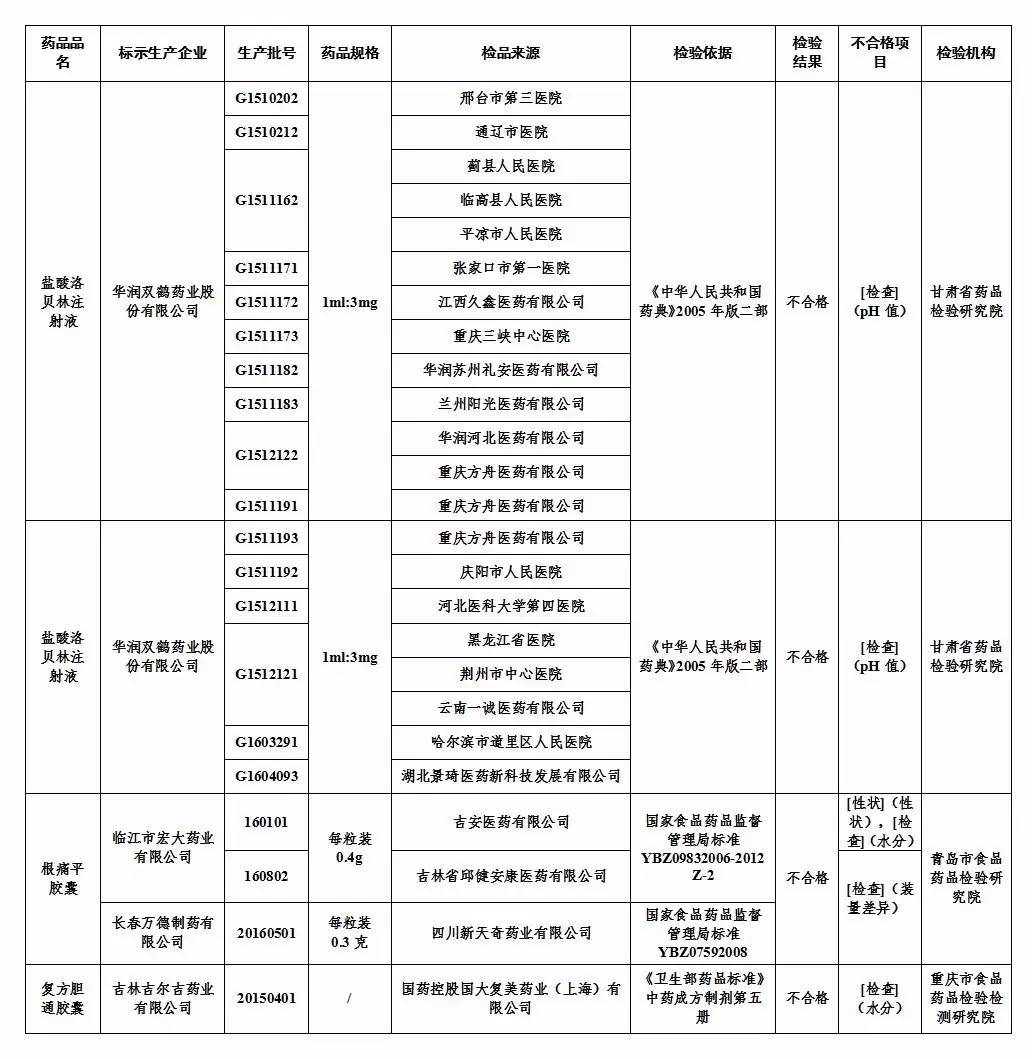 根据通告,不合格药品情况为:华润双鹤药业股份有限公司生产的16个批次盐酸洛贝林注射液,临江市宏大药业有限公司生产的批号为160101、160802的根痛平胶囊,长春万德制药有限公司生产的批号为20160501的根痛平胶囊,吉林吉尔吉药业有限公司生产的批号为20150401的复方胆通胶囊。不合格项目包括pH值、装量差异、水分、性状。