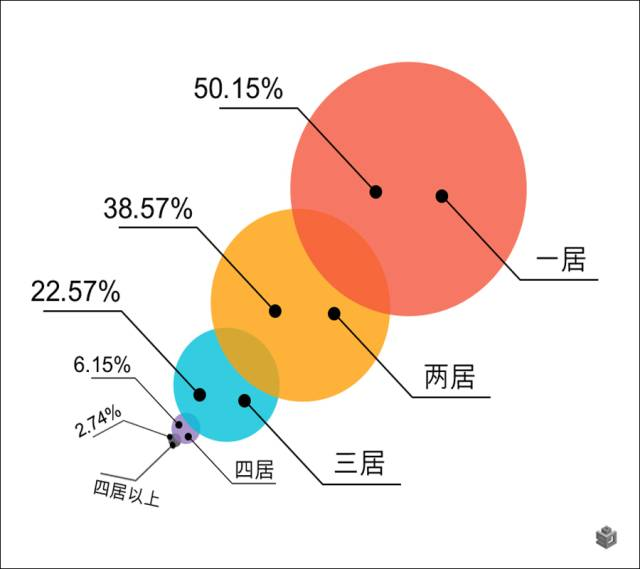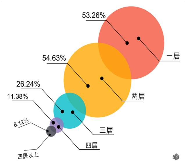从图14-图17可以看出,一居和两居室,在四个一线城市中都是关注度最高的。其中,一居室的关注率,北京、上海、广州、深圳四个城市分别为45.82%、53.26%、50.15%、52.9%;两居室的关注率分别为41.07%、54.63%、38.57%、53.54%。