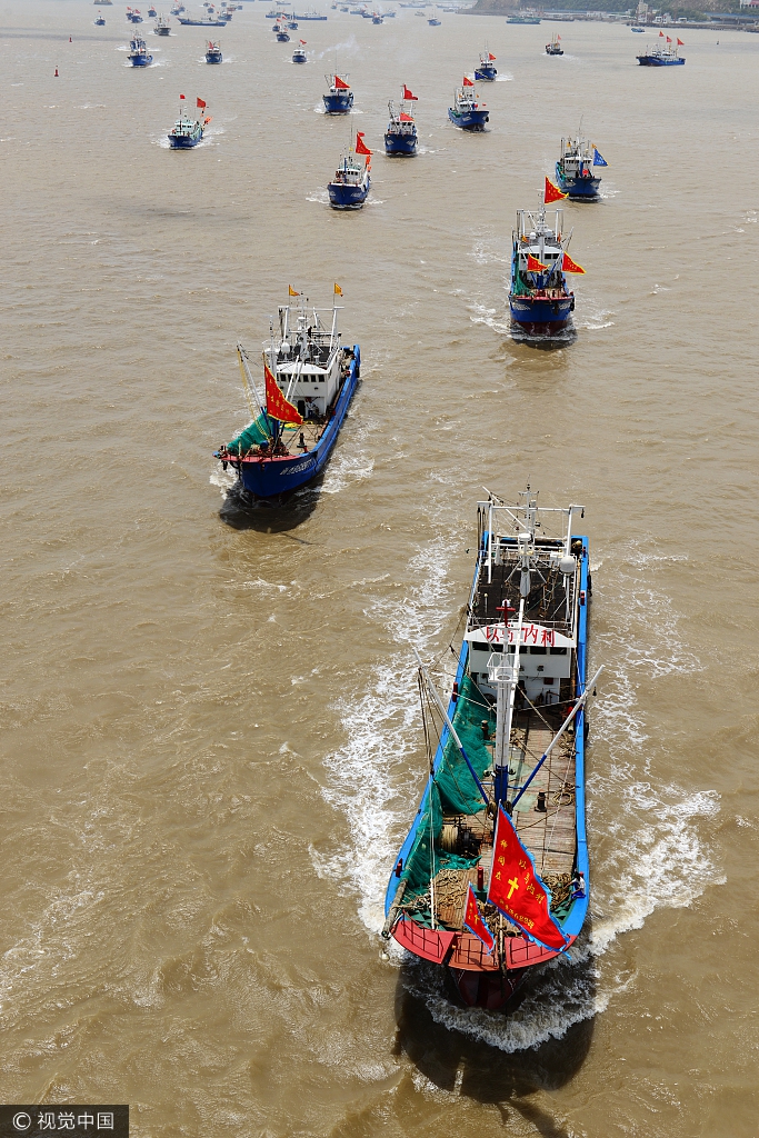 2017年8月1日,浙江舟山,整修一新的渔船从舟山市沈家门渔港出发,浩浩荡荡驶向东海渔场。当天中午12时起,为期3个月的桁杆拖虾、笼壶类、刺网类、围网类及船敷箕状敷网类5类作业渔船结束伏休,舟山市共有3575艘渔船及渔运船解禁奔赴渔场,预计两天后新鲜海货将端上百姓餐桌。
