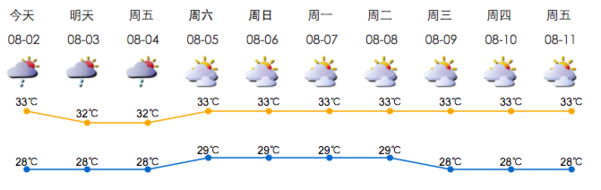 我市多云,有阵雨或雷阵雨;气温28-33℃;西南风2-3级;相对湿度65%-95%