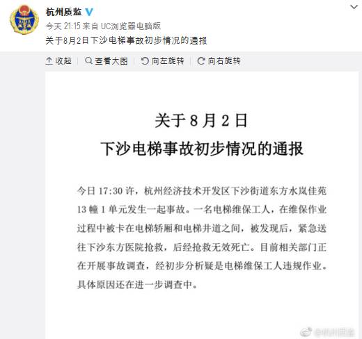 杭州市质检技术监督局昨晚21点15分发布通报: