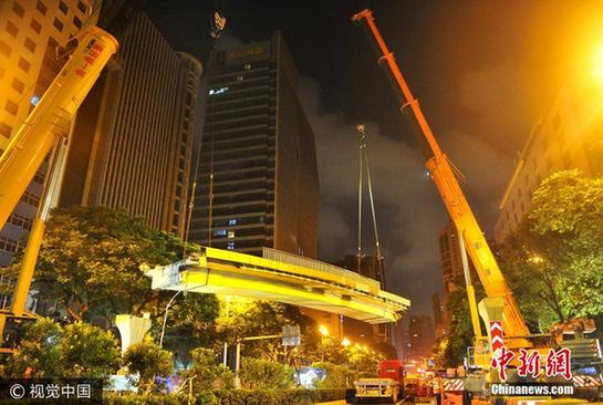 8月6日凌晨,因多次被撞而被媒体称为“最悲催”天桥的东风路福今路人行天桥被拆除。由于水泥墩设置在机动车道上,该天桥至少已被撞6次,经有关部门检测评定为D级,对行人和交通存在安全隐患。拆除前天桥已禁止行人通行。据了解,天桥拆除重建工作施工期约30天,施工期间,行人过街需绕道农林下路路口人行横道或梅东路人行天桥。图片来源:视觉中国