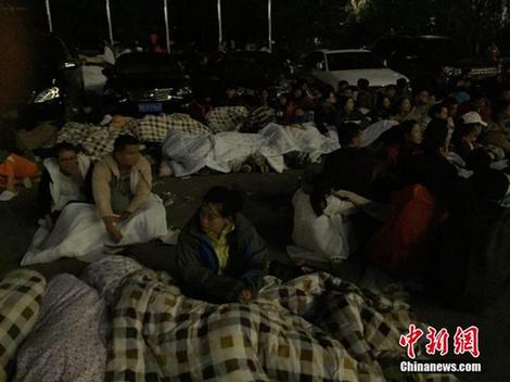据中国地震台网正式测定:8月8日21时19分在四川阿坝州九寨沟县发生7.0级地震,震源深度20千米。震中距九寨沟县39公里,九寨沟景区震感强烈,景区内部分酒店受损。图为九寨沟景区内,许多游客不敢继续待在酒店内,裹着厚衣服和毛毯来到街上席地而睡。徐广 摄
