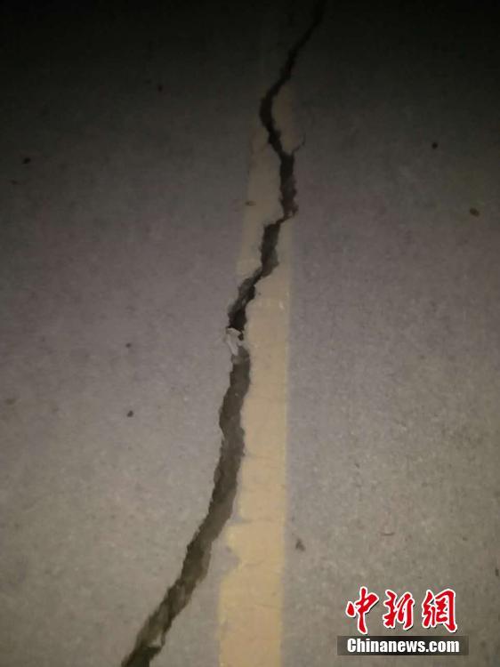 地震后到九寨天堂的公路出现裂缝。 图片来源:阿坝消防