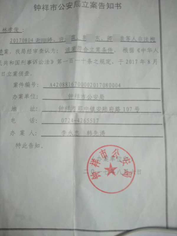 钟祥市公安局提供给林孝俊的一份立案通知书显示,“谢某婷、许某霖、郭某东、卿某崇等人非法拘禁案,我局经审查认为:该案符合立案条件,根据《中华人民共和国刑事诉讼法》第一百一十条之规定,于2017年8月4日立案侦查。”