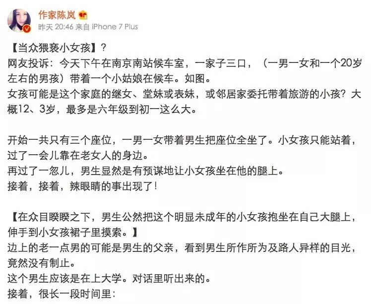 作家陈岚称目击者看到当时年轻男子不止一次 猥亵了小女孩。