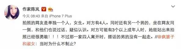 也有网友质疑为何拍照者不站出来制止?作家陈岚表示,拍照者是单独一人,而且是女生,对方可能有4个成年人(拍照女生身旁还坐着一个对方的熟人),她能拍下照片已经很勇敢。