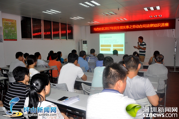 深圳新闻网坪山讯(记者 史韬 邱嘉熙 通讯员 张伟 朱冠南 王菲)日前,在马峦社区“幸福园区”项目组举办了一场以《劳动合同法》为主题的知识讲座,共吸引园区内外共40余名员工现场参加.