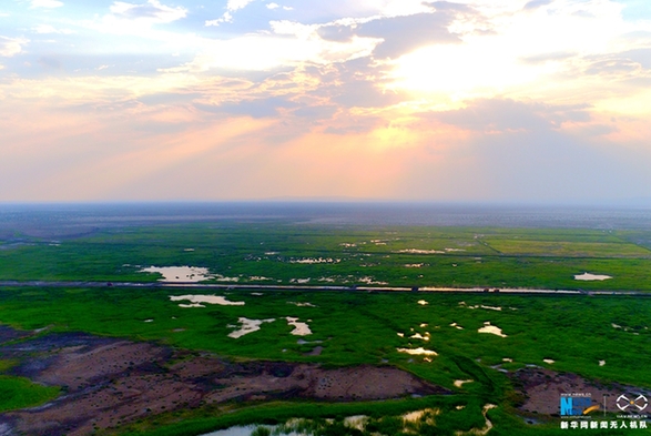 为保护生态、守卫家园,民勤人民与风沙抗争,通过干部群众义务投工投劳和重点生态项目支撑相结合的方式,采取工程压沙、人工造林、封沙育林(草)、退牧还草等各项治理措施,干涸了半个多世纪的青土湖于2010年“起死回生”。 2010年至2015年,青土湖水面由3平方公里扩大到22.36平方公里。2016年,青土湖水域面积进一步扩大至25.16平方公里,干涸51年之久的青土湖连续7年形成水面。青土湖地下水位埋深由2007年的4.02米上升为2016年底的2.99米,上升1.03米,形成了约106平方公里的旱区湿地。图为航拍“起死回生”的青土湖。新华网发王生元 摄