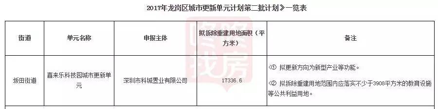 2017年8月14日,龙岗区城市更新局批准《2017年龙岗区城市更新单元计划第二批计划》,现予以公告。此次龙岗区城市更新单元第二批计划仅一个项目,坂田街道喜来乐科技园城市更新单元。