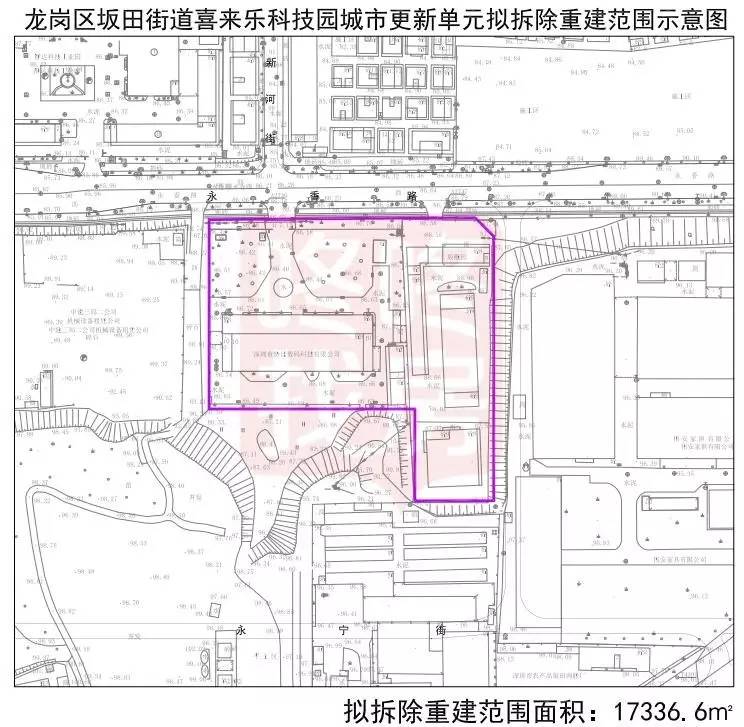 喜来乐科技园更新单元位于龙岗区坂田街道永香路以南,坂雪岗大道以东,永宁街以南,拆除重建范围面积为17336.6㎡,若按一般工业用地容积率为3来计算,其总建筑面积为52009.8㎡。拟更新方向为新型产业为主,拆除重建用地范围内应落实不少于3908㎡的教育配套等公共利益用地。