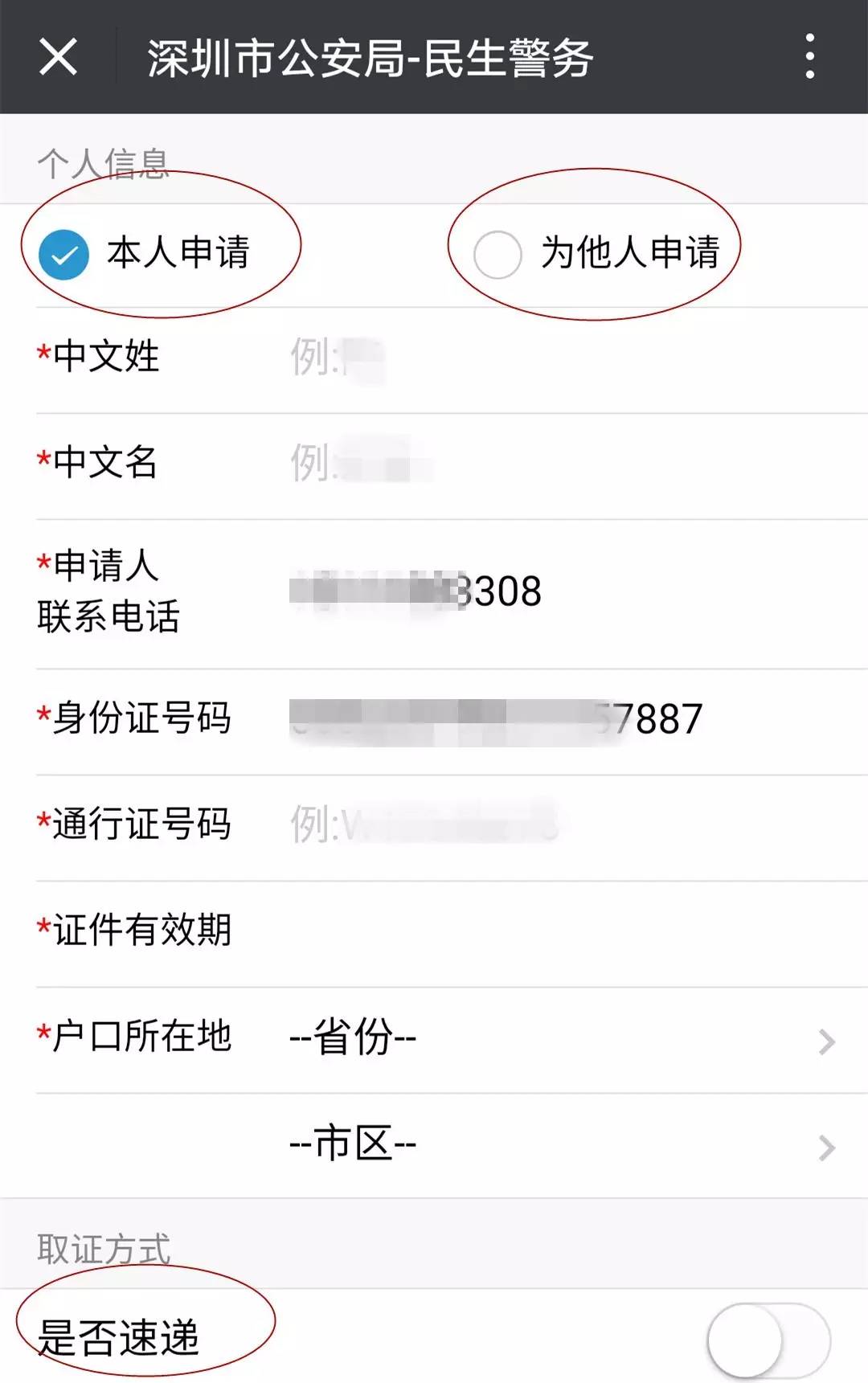 选择“本人申请”或“为他人申请”,并如实填写“个人信息”,若不选择速递,点击“申请”,即可完成;若选择速递,填写相关信息后,点击“申请”,即可完成。
