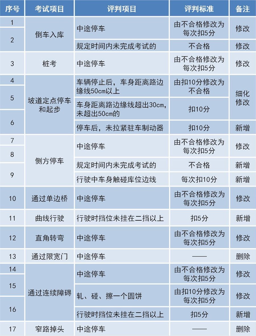 小型车考试内容“夜间行驶”修改为“模拟夜间灯光使用”。汽车类驾驶证考试全部使用机动车驾驶人场地驾驶技能考试系统进行评判。大型车考试不合格当场补考时,未扣分的已考项目不再补考。