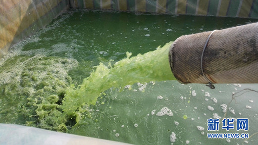 这是蓝藻集聚造成的绿色湖水。(杜晓磊 苏自山摄)