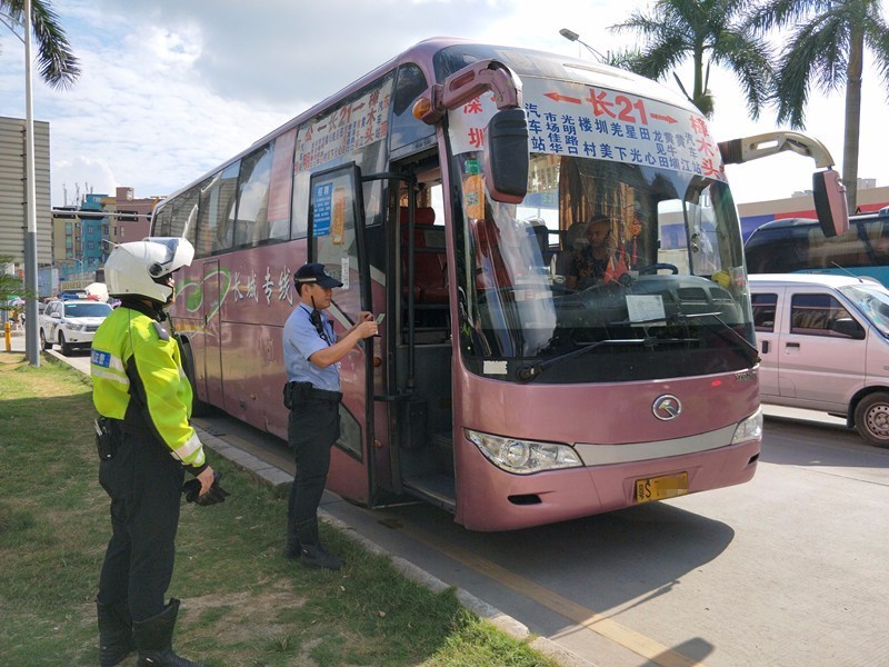 2017年8月16日上午,深圳交警光明大队铁骑接到大队情报中心指令,一辆达到报废标准的粤S号牌长途大巴驶入光明辖区,铁骑民警接到指令后立即出动,于上午9点30分许,在光明新区松白路公明汽车站路段将该车查获,并现场依法对该车进行查扣。