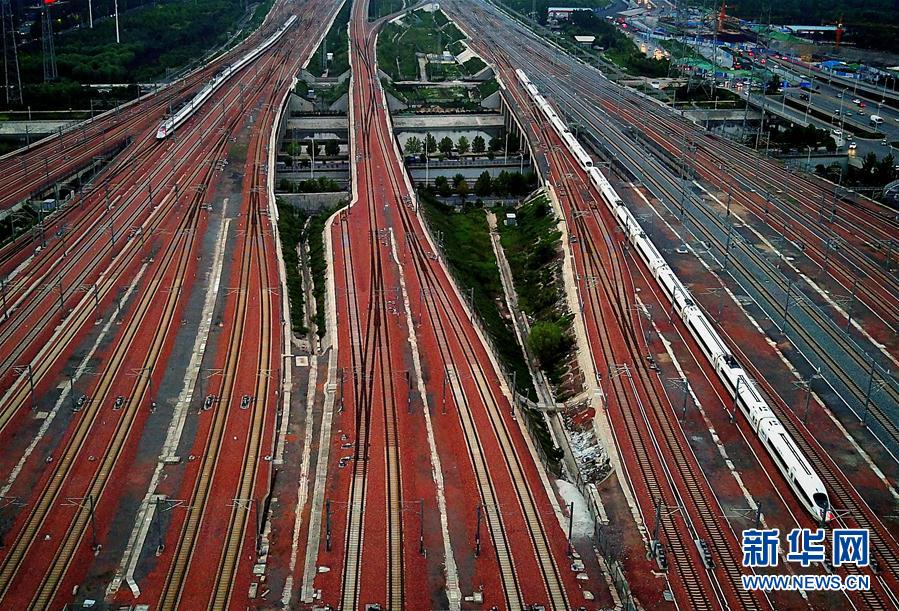 两列动车组列车驶入郑州东站(8月17日摄)。新华社记者李安摄
