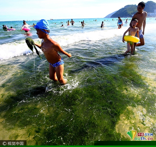 海南三亚大东海遭绿藻“入侵” 游客依旧下水沉浮