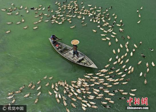 8月23日消息,在孟加拉国Dhunat Upazila,100多只家养的鸭子在当地Karatoa河上围绕着农夫的小船,等待农夫喂食。 图片来源:视觉中国