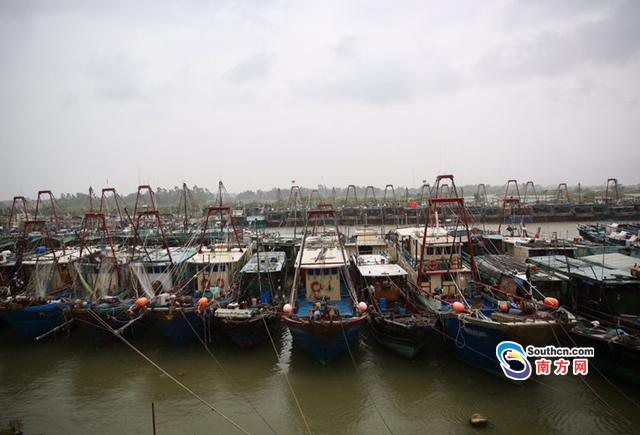 “天鸽”已给广东带来明显风雨影响。图为台山市横山渔港,台风即将登陆时,渔民们加固渔船。