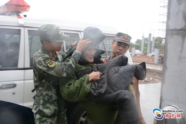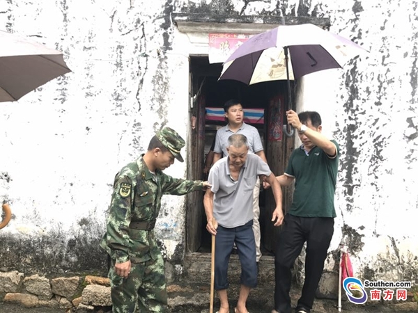 “天鸽”已给广东带来明显风雨影响。图为江门边防官兵与政府干部转移台山市北陡镇群众。