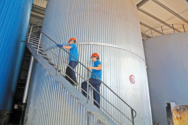 工作人员检查大油罐,里面装满了地沟油转化而成的可用油脂。