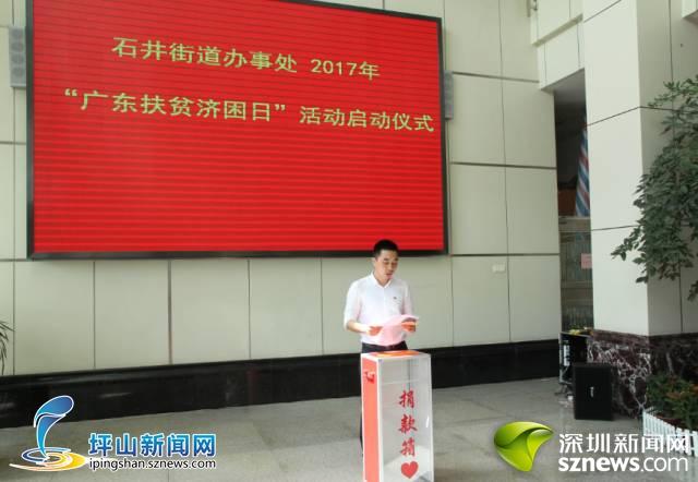 深圳新闻网坪山讯(记者 邱嘉熙 通讯员 蔡传河)日前,石井街道办事处在办事处一楼大堂举行2017年“广东扶贫济困日”活动启动仪式,号召弘扬扶贫济困、奉献爱心的传统美德,为“广东扶贫济困日”活动添砖加瓦。石井街道党工委副书记、办事处主任孙艳琼及街道办部分班子成员,各机关单位负责人、各社区书记、股份公司董事长等参加启动仪式。