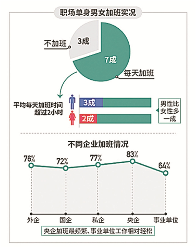 企业不同,加班的情况会有不同吗?调研显示,外企单身男女加班占比为76%,国企单身男女加班占比72%,私企单身男女加班占比为77%,央企单身男女加班占比为83%,事业单位单身男女占比仅为64%。可见,央企加班最频繁,事业单位工作相对轻松。