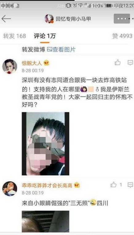 8月28日凌晨,深圳网警收到网民举报,昵称为“惊鲵大人”的用户在其新浪微博上发布信息,扬言要炸深圳高铁站,同时晒出枪支照片。