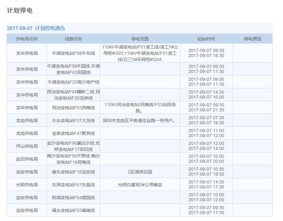 9月7日计划停电区域