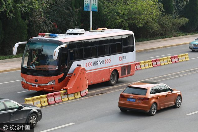 2017年9月3日,山东济南首台能自动设置潮汐车道的拉链车和它的水马隔离墩“搭档”在旅游路上工作。文字来源:齐鲁晚报图片来源:视觉中国