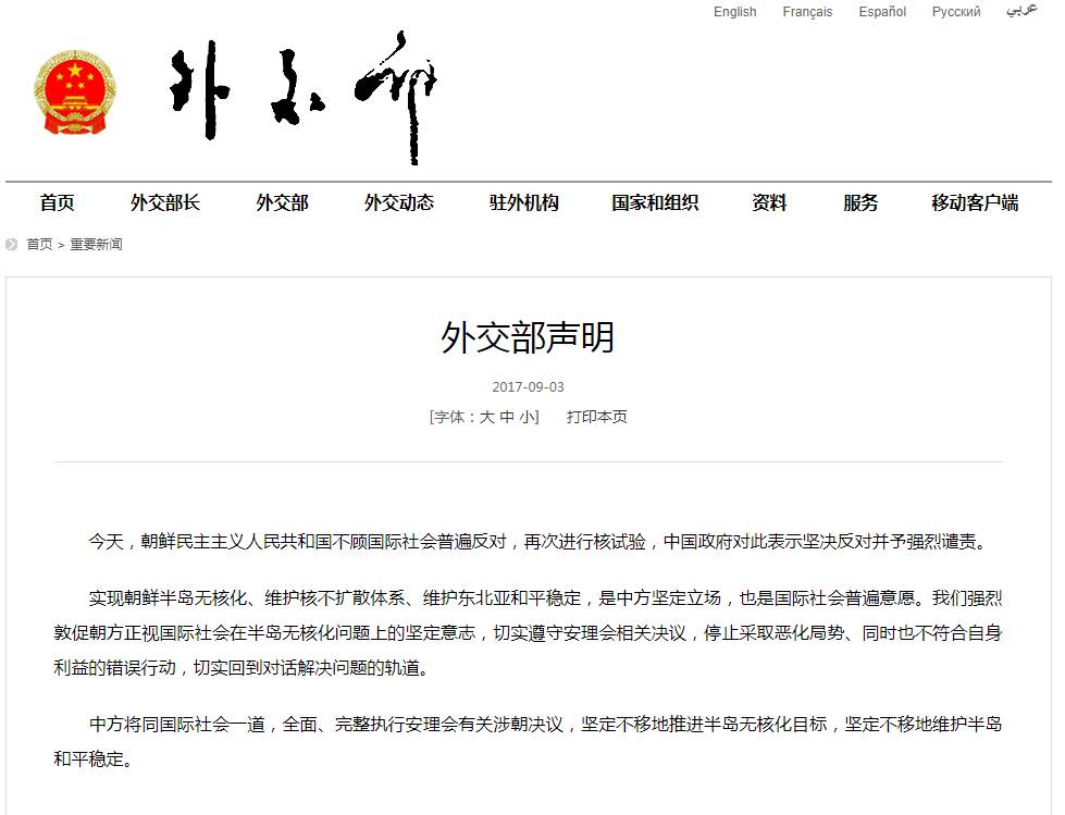 外交部3日就朝鲜再次进行核试验发表声明。声明全文如下: