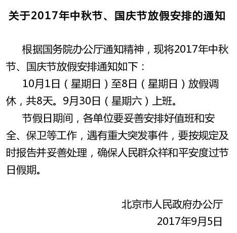 2017年中秋节、国庆节放假安排的通知已发布啦!