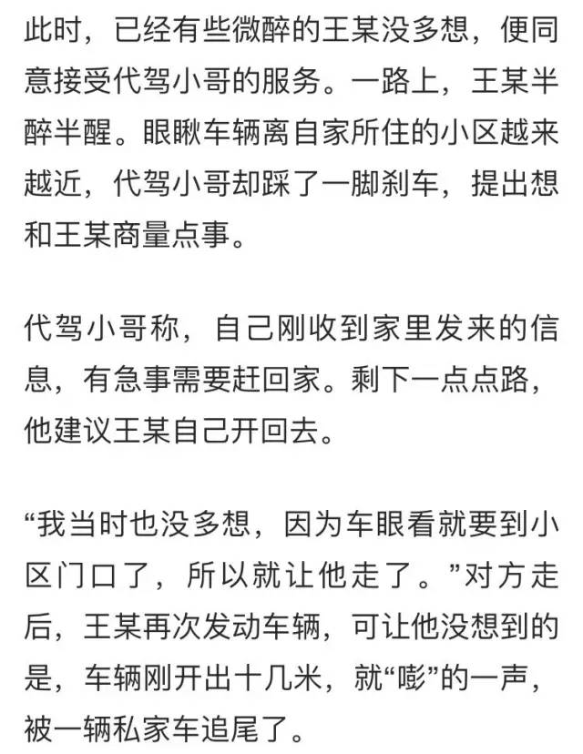 后车司机看王某下车就说:“看你这一身酒气的,私了还是报警?”王某心想,酒驾可是大事,被告了还得判刑,便对车主说道:“您看我也是确实喝了点酒,看您这保险杠就刮花了那么点,给您3000元维修,咱就私了吧。”