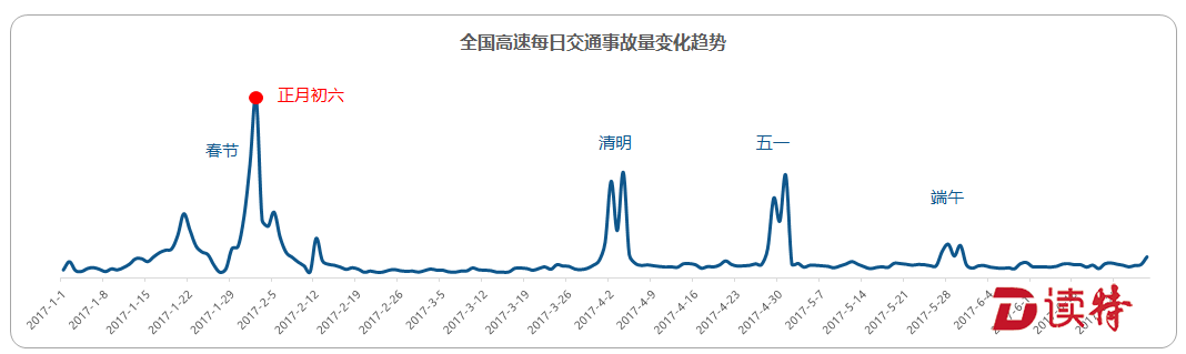 报告显示,全国高速事故量受节日影响明显,上半年的事故量峰值日出现在农历正月初六,正好是春节假期最后一天。此外五一、清明假期的事故量要高于端午,原因之一可能是端午小长假高速不免费。