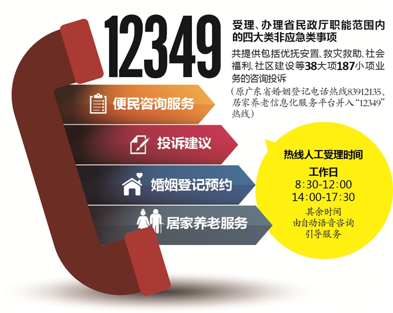 深圳新闻网讯 昨天从市民政局获悉,广东省民政厅“12349”民政服务热线已正式上线运行。据了解,“12349”热线是省民政厅面向公众集电话、微信等受理服务功能于一体的民政公共服务平台,实现新媒体技术和传统呼叫中心技术的无缝对接。省民政厅方面表示,将结合实际需求,拓展灾害救助、殡葬管理等业务办理服务事项,并统筹延伸到地市,构建省、市二级运行通信支撑网络,实现“12349”热线省、市两级全覆盖。