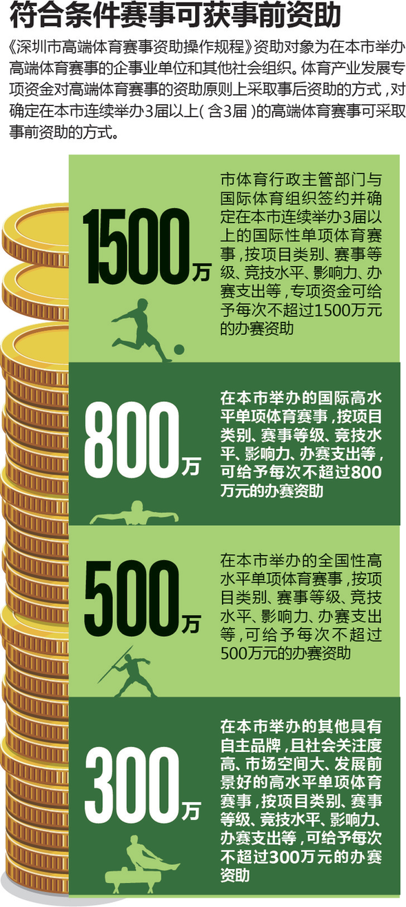 按《深圳市高水平职业体育俱乐部资助奖励操作规程》规定,在深圳注册并冠“深圳”队名,参加职业联赛的足球、篮球和排球职业体育俱乐部,参加全国最高级别职业联赛的,可给予每赛季不超过2500万元的资助;参加其他级别全国职业联赛的,可给予每赛季不超过1500万元的资助。在深圳注册并冠“深圳”队名,社会关注度高、市场空间大、发展前景好的网球、乒乓球、羽毛球、高尔夫球和帆船等职业体育俱乐部,按项目类别、影响力、参加职业联赛或赛事等级、投入和名次等,专项资金可给予每赛季或每年不超过800万元的资助。