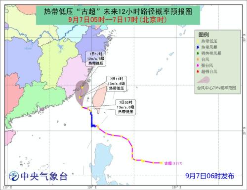 预计,“古超”将以每小时15-20公里的速度向北偏西方向移动,逐渐向福建中部沿海靠近,强度继续减弱,可能于今天傍晚前后在福建中部一带沿海登陆(5-6级,10-12米/秒),也可能在台湾海峡内减弱消失。由于“古超”已减弱为热带低压,且对我国的影响趋于减小,中央气象台于今天早晨6点钟解除台风蓝色预警。
