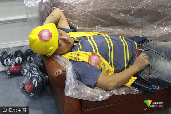 据了解,这名工人姓张来自安徽,前一天因为工期紧张,加班至凌晨4点左右,因为疲倦想靠在沙发上休息一会,未料竟睡过了头。在躺下之前他将一张塑料薄膜铺在了沙发上,生怕弄脏了展品。