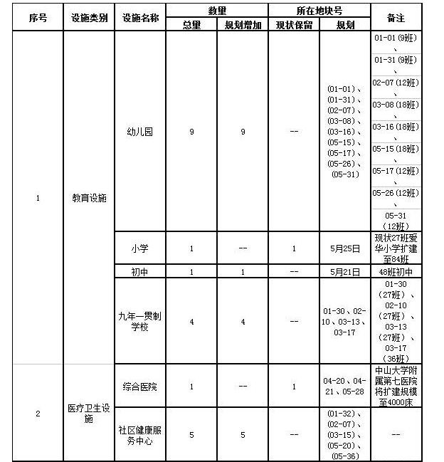 结合公园绿地和城市更新设置公共设施。教育设施按满足8.5万人配置的前提下,适当为周边地区作预留。 其它公共配套设施(包括医疗、体育、文化、商服等)按10万人配套。