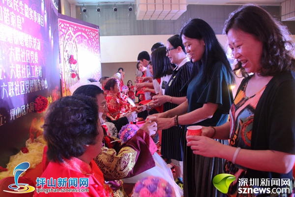 本次活动邀请到坪山区坪山街道办办事处党工委员李顺平和六联工作站副站长黄凤婷分别上台讲话,为现场的金婚银婚老人致以诚挚的祝福。随后,7对金婚银婚老人在一段温馨的音乐下由儿女代表手挽着缓缓导入舞台,并向父母敬茶。“我们父母以前结婚时没有拍过婚纱照,也没有很好的生活条件能够举办婚礼,感谢社区领导给了我们这个机会见证我爸妈的婚礼”一位子女代表饱含深情的说到。