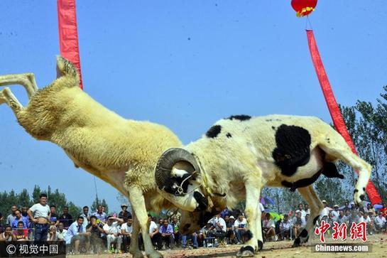 9月12日,山东聊城阳谷县李台镇四连村第十六届斗羊大赛”活动现场,村民们在观看斗羊比赛。当日,山东省阳谷县李台镇第十六届斗羊大赛在四连村文化广场举行,来自该县及聊城、莘县、单县、庆丰、鄄城、梁山等20多个县市的养殖户带着200余只抵羊参赛,观众达2000余人。比赛根据不同羊龄分别设一、二、三等奖和冠、亚军。阳谷县在每年的重大节日和国家重大活动期间,都要组织大规模的斗羊大赛。斗羊大赛不仅愉悦观众,还是优良品种交流、展示和推介的平台,调动了农民养羊的积极性,抵羊大赛是群众喜闻乐见的文化体育活动。赵玉国 摄 图片来源:视觉中国