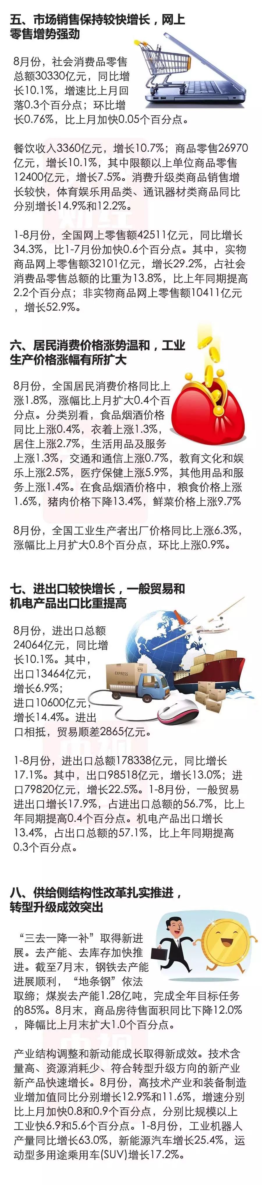 8月份,全国规模以上工业增加值同比实际增长6.0%,增速比上月回落0.4个百分点; 8月份,社会消费品零售总额30330亿元,同比增长10.1%,增速比上月回落0.3个百分点; 1-8月份,全国固定资产投资(不含农户)394150亿元,同比增长7.8%,增速比1-7月份回落0.5个百分点。