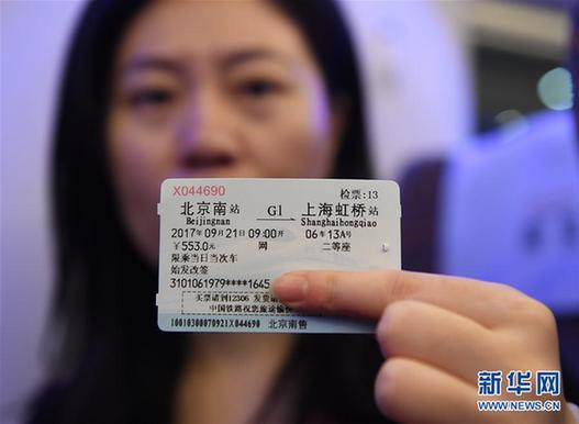 9月21日,一名乘客在G1次“复兴号”列车内展示车票。 9月21日9时整,G1次中国标准动车组“复兴号”驶出北京南站,瞬间提速。历经4小时28分的飞驰,抵达上海虹桥站。其疾如风!一路上,“复兴号”最高时速达到355公里。350公里时速的正式运营,标志着我国成为世界高铁商业运营速度最高的国家。新华社记者李贺 摄