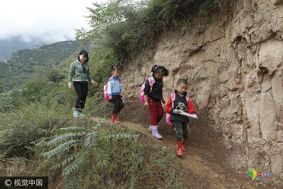 除了完成教学工作,张军燕每天都要烧开水,给孩子们温牛奶。课间休息时,张军燕与孩子们做游戏,给孩子们讲故事;中午,张军燕给离家较远、父母不在身边的孩子做饭;天热了,张军燕给孩子们理发,天冷了,张军燕给孩子们生火;遇到下大雨家长没能及时接的孩子,张军燕就把他们送回家……图为:张军燕护送孩子放学。蓝镜/视觉中国