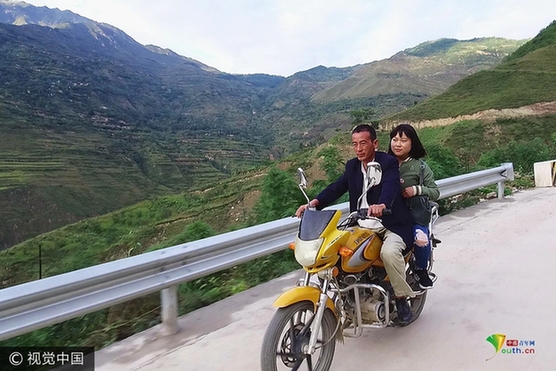 张军燕搭乘村民的摩托车下山去桥头镇坐大巴回家。蓝镜/视觉中国