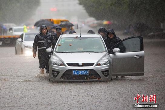 9月25日,南京城东银城东苑门口的道路上,市民在积水中涉水而行。持续的暴雨导致南京城不少路段严重积水,给市民的出行造成极大的影响。泱波摄