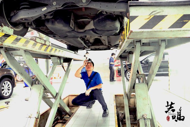 闷热的汽修间里传来"咔、咔、咔……"的声音,黄豫坤拿着一部微单,围着一辆事故车前后左右,有时甚至钻到车底下,对每一个受损部件进行拍照记录,还不时向汽修员询问零件的拆卸情况。这是一辆被追尾的事故车,排气管损坏,目前刚完成拆检,在等待原装配件。由于车身受损面积不大,前后拍照大约花了10分钟。看着被拆散的事故车,黄豫坤笑道:"我天天就看这种车。"